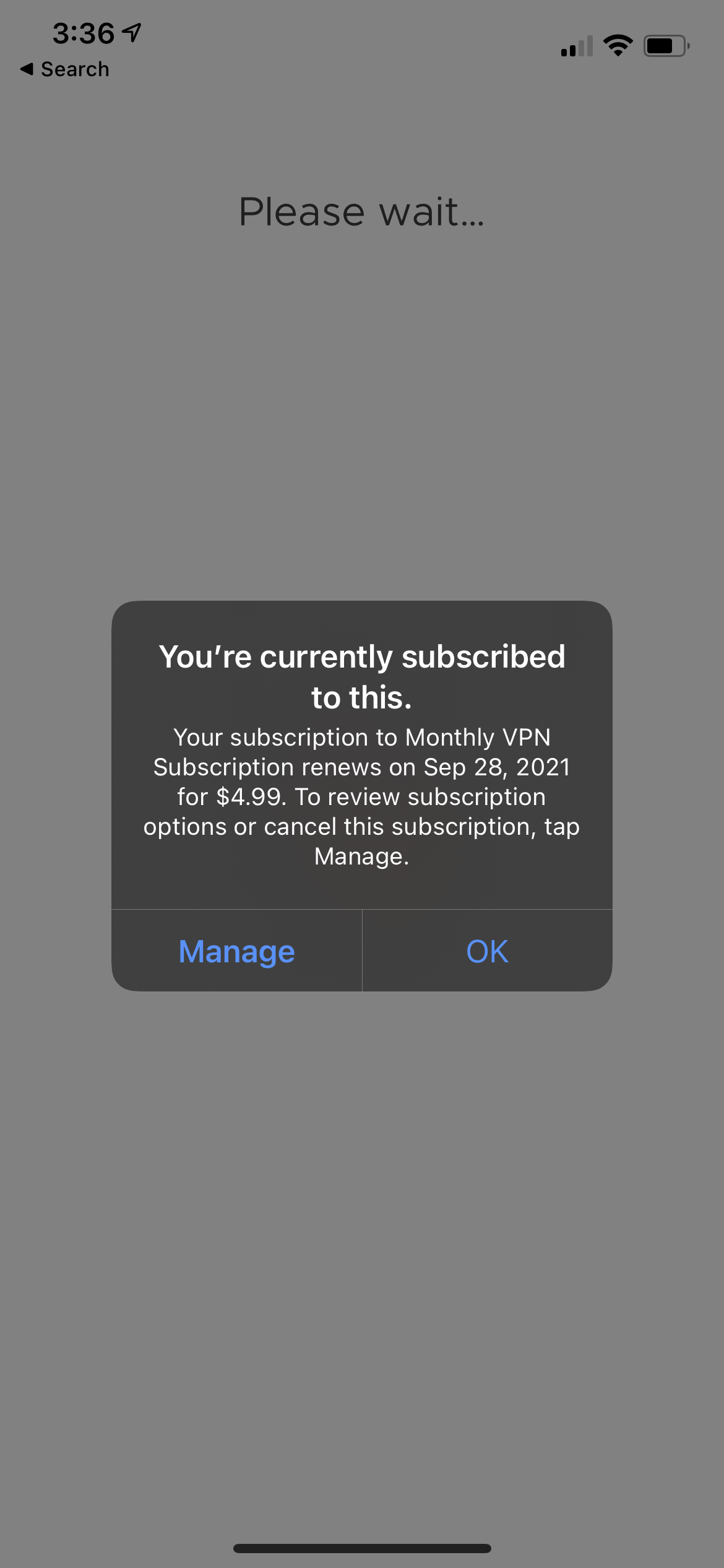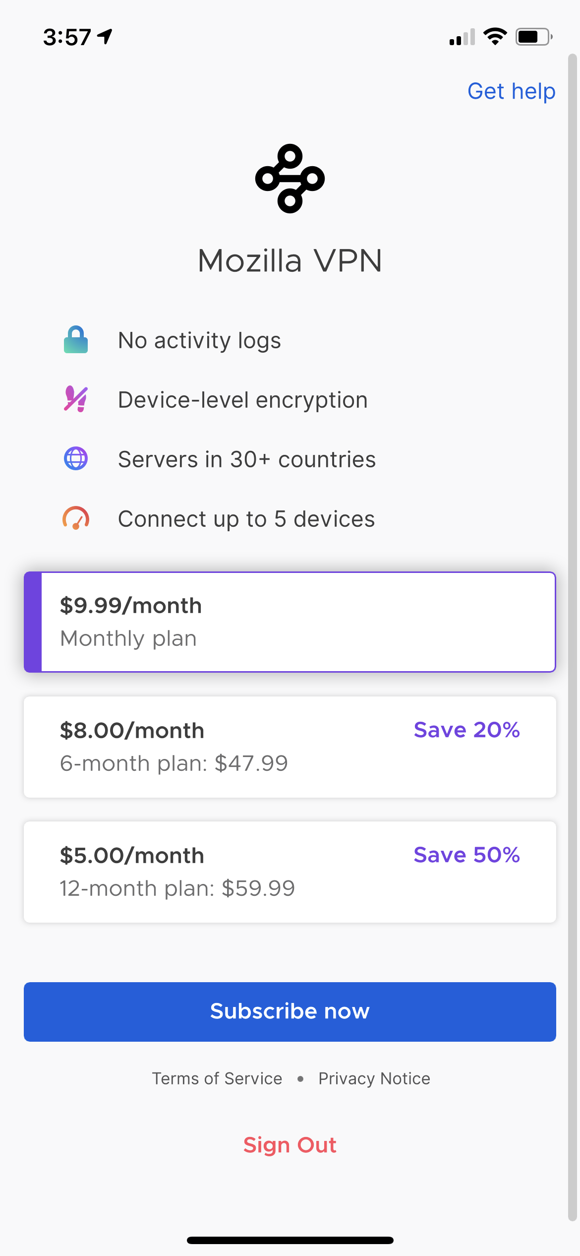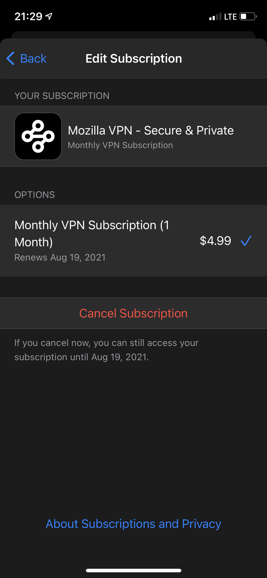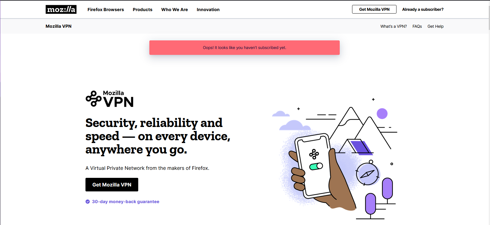 I was recently grandfathered into a subscription of $5/month, and I am having an error message now on Mozilla VPN saying that I am not subscribed and should start a subscription, even though I just got a bill from Apple (where I started the subscription) today. I don't know what caused this, but I am frustrated that I am being billed for a product that will not work.