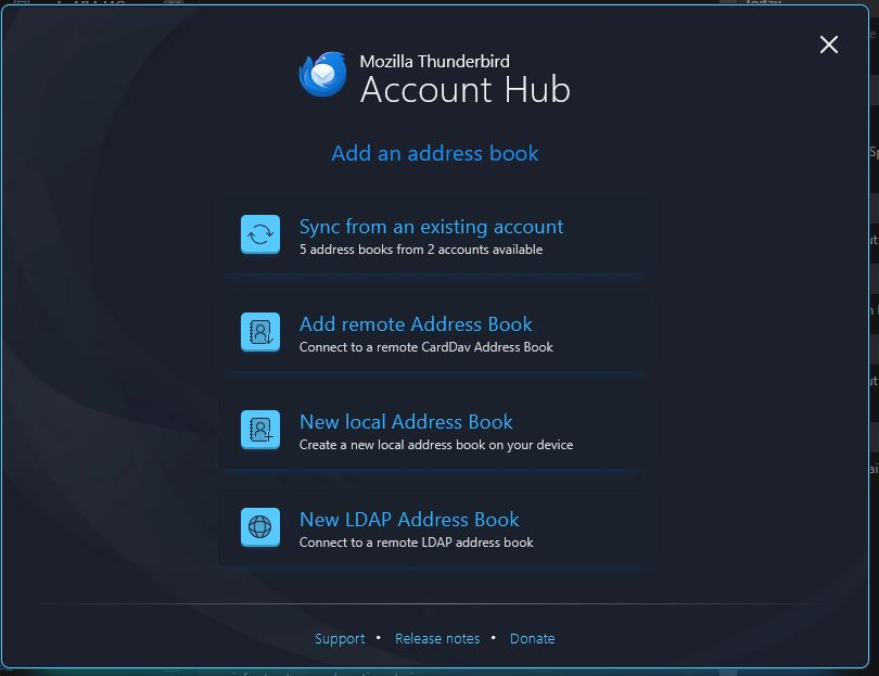 I just installed Thunderbird on a new computer. I hadn't used Thunderbird in some time. I can't seem to add ANY remote address books. There is an option to add an address book account. When I click on it, I get a dialogue box which lists several options which get highlighted whenever I mouse over then, however, when I click on ANY of the options, nothing happens.