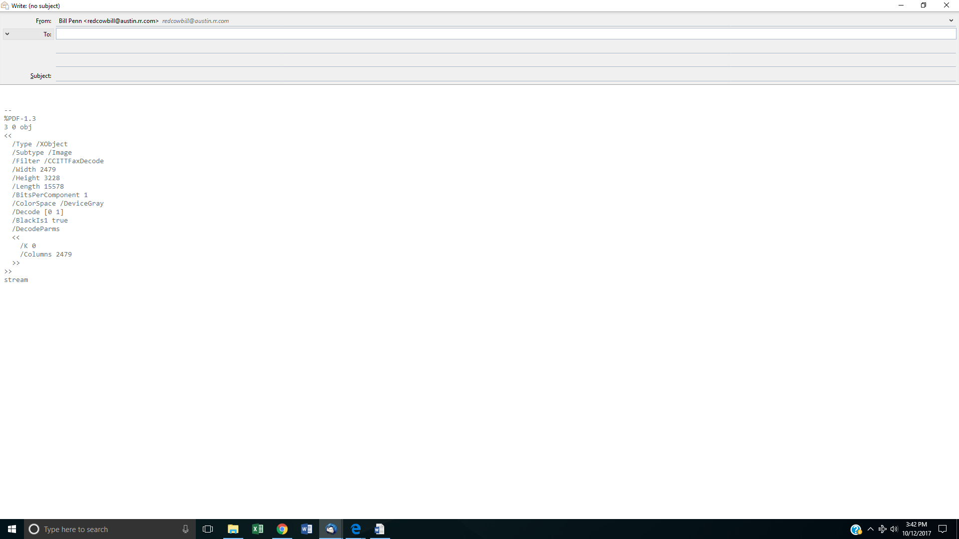 Here is the code/text that appears on the "Write" tab when I click into it... appears in the body of the email. That needs to be removed also. -- %PDF-1.3 3 0 obj <<