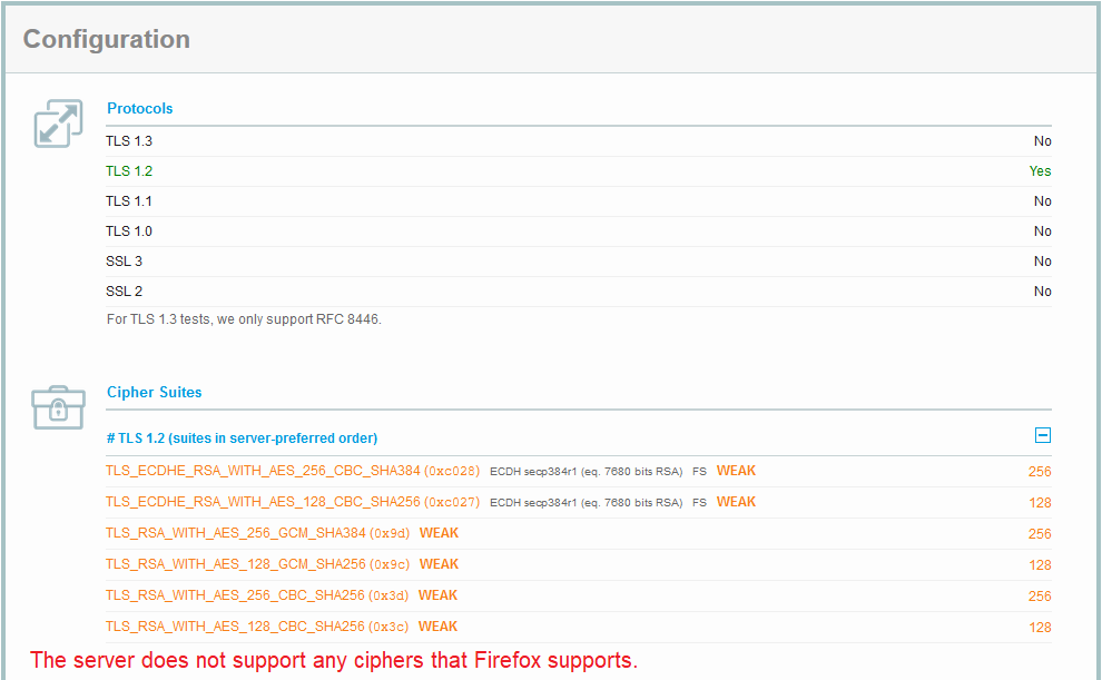 As the above diagnostic shows, the server doesn't share any encryption ciphers in common with Firefox (see attached).