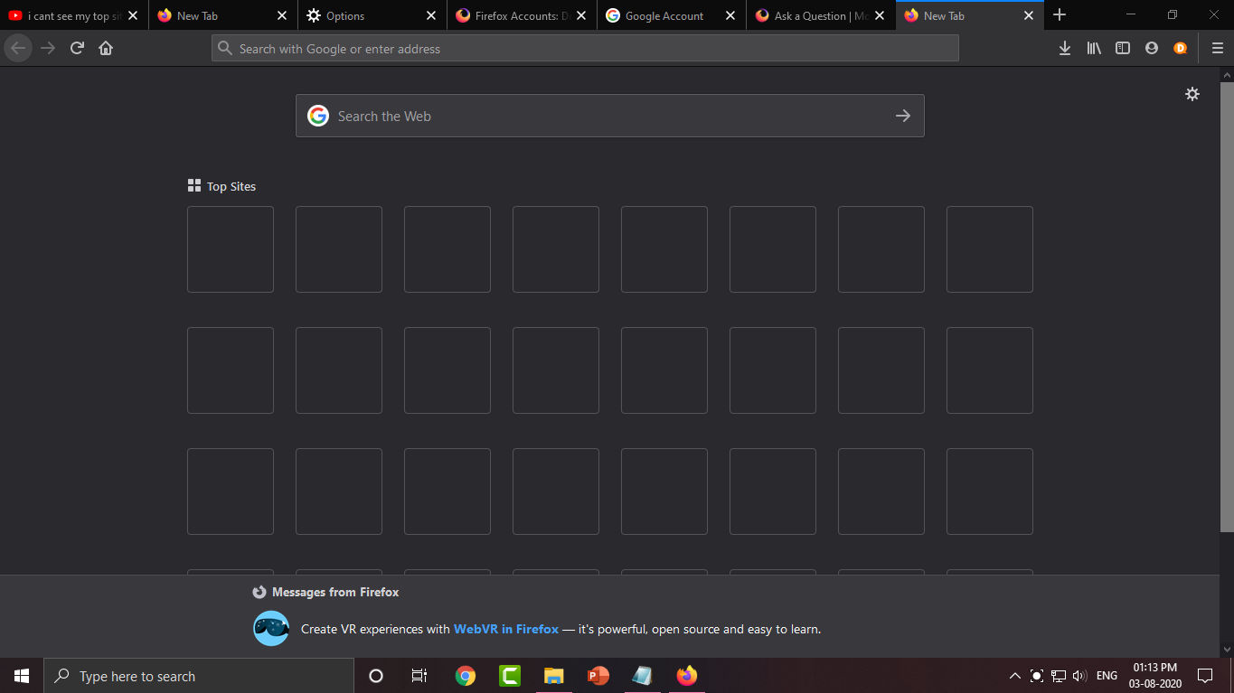 Utas ini telah diarsipkan. Silakan membuat pertanyaan baru jika Anda membutuhkan bantuan. i cant see my top sites in firefox Tidak ada balasan 1 memiliki masalah ini 10 kunjungan legendking99997777 02/08/20 17.44 is this a glicth or error plz fix it is this a glicth or error plz fix it Lampiran tangkapan layar