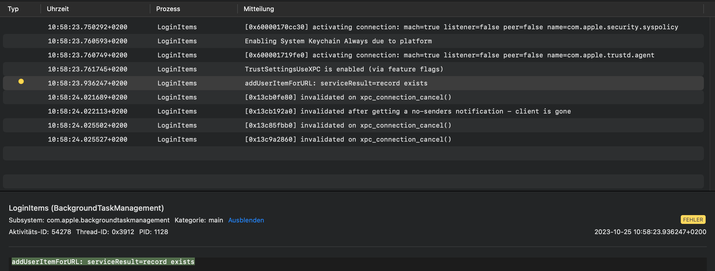 When I try to add Firefox as a login item and Thunderbird is already present in the login item the following error appears in the macOS console: Process "LoginItems" - "addUserItemForURL: serviceResult=record exists" (see attachment)