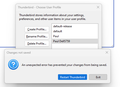 When I try to switch profiles, I get the following error: An unexpected error has prevented your changes from being saved. I have been messing around with this on and off for a couple of months. I uninstalled Thunderbird and re-installed with no luck. This error is not allowing me to switch to a profile that I have had for over 20 years and I have lost all my Local Folders, quite disturbing. I found a similar thread here, but no solution. Thanks, Paul