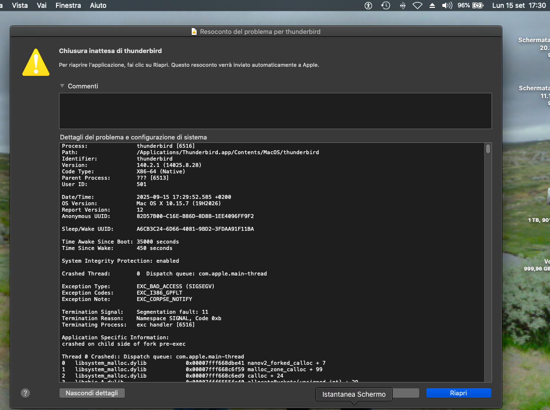 Buon giorno, ho Thunderbird su MacBook Pro, la versione è 140.0.1 64 bit, chiudo il programma normalmente, mi compare una schermata dal titolo "Chiusura inattesa di Thunderbird", una lunga lista di "Dettagli del problema e configurazione di sistema" e due scelte finali, "Ok" o "Riapri", io ovviamente premo "Ok" e scompare la schermata. Ad ogni riutilizzo di Thunderbird, si ripresenta il problema alla chiusura. Il problema si presenta dall'inizio di settembre 2025 circa. Allego due immagini, con la prima schermata e lìultima parte della lunga lista dei "Dettagli..."