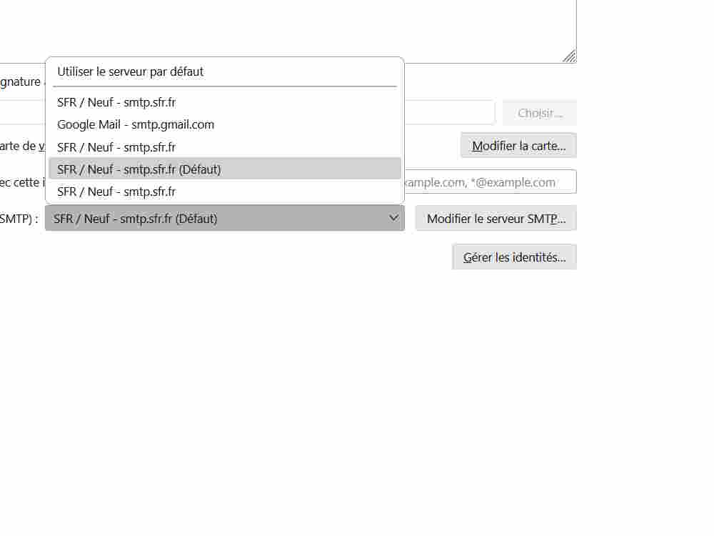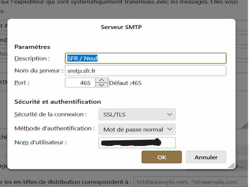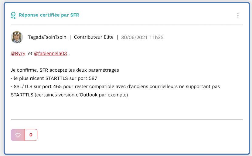 Tu peux aussi essayer cette alternative pour le SMTP de SFR: STARTTLS sur le port 587 (image) ... Trouvé ici https://la-communaute.sfr.fr/t5/sfr-mail/thunderbird-refuse-smtp-sfr/td-p/2303523