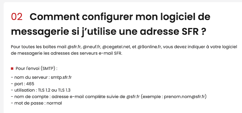 Hello, sur cette page https://assistance.sfr.fr/sfrmail-appli/sfrmail/configurer-messagerie-recevoir-email-sfr.html j'ai trouvé les paramètres suivants pour configurer le SMTP de SFR.(image)