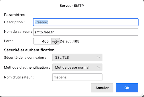 Hello, I went to "account settings," then "edit SMTP server," and there... I don't have "description". When I click on "edit server," I get the window shown in the screenshot, where the problematic email address is clearly displayed.