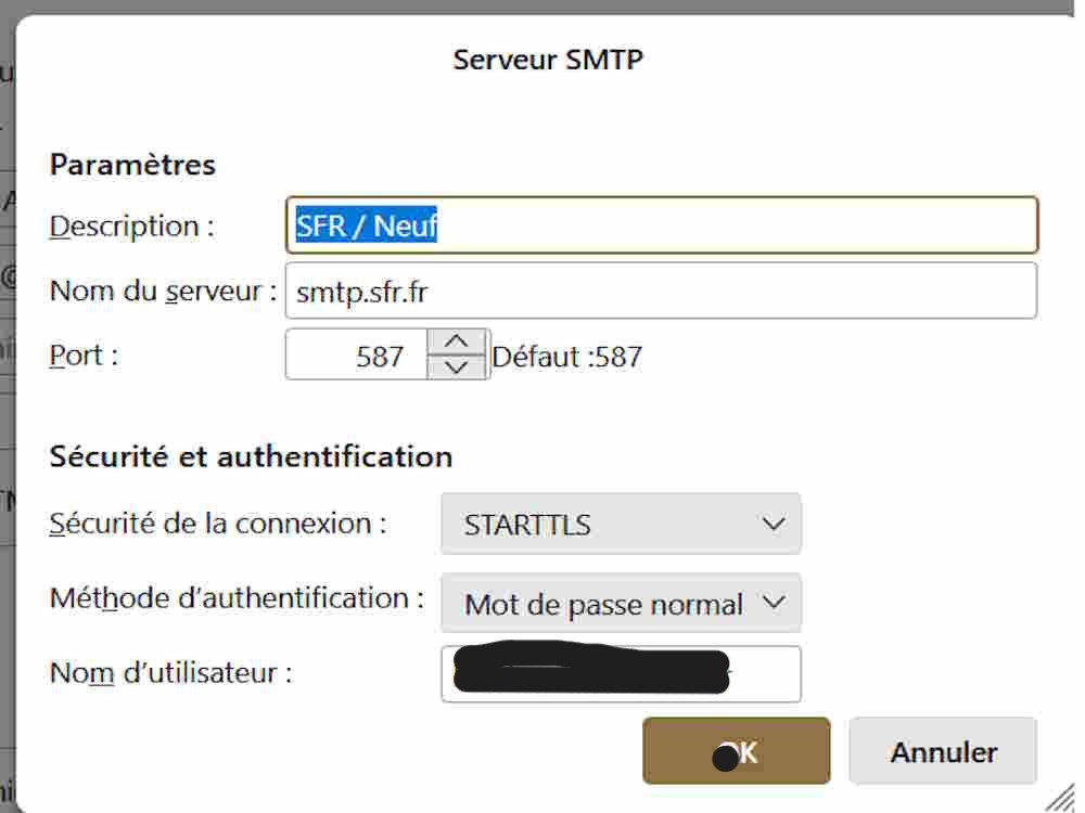 Qu'est-ce que tu as renseigné dans le champ "Nom d'utilisateur" ? L'adresse émail complète ou juste la partie devant l'arobase @ ? Ça peut varier d'un fournisseurs à l'autre ...