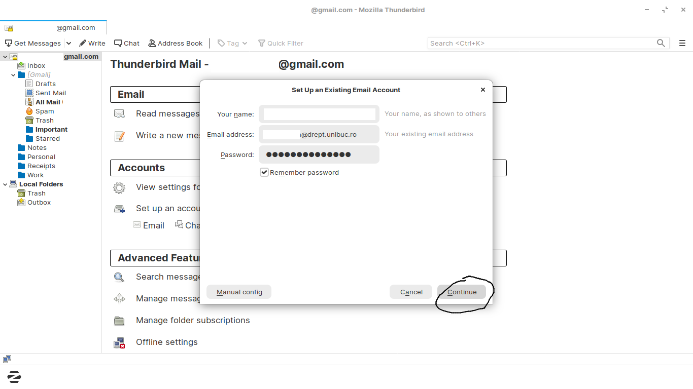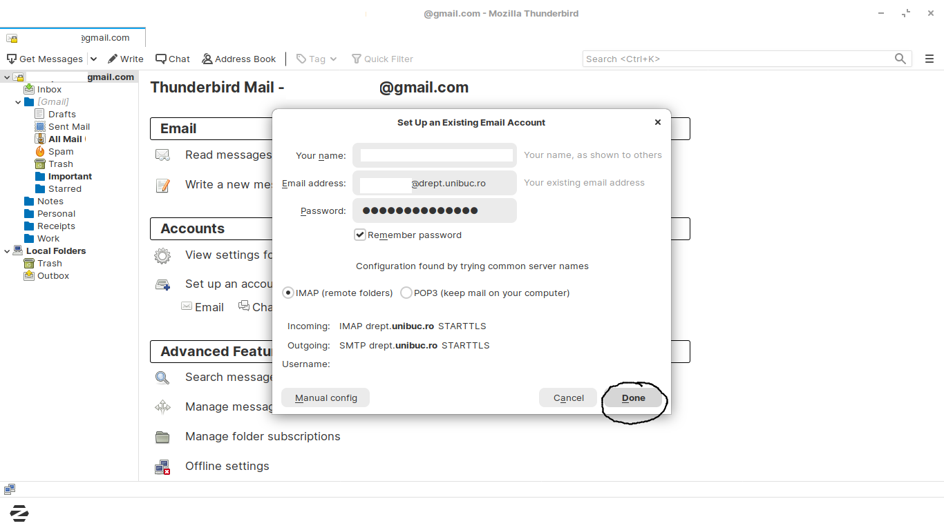In your 3rd picture, don't click Done, click Manual config. and enter the correct gmail settings: incoming IMAP server imap.gmail.com on 993, SSL/TLS, OAuth2 authentication, User name = your unibuc.ro address; outgoing SMTP server smtp.gmail.com on 587, STARTTLS, (or 465 SSL/TLS), OAuth2 authentication, User name = your unibuc.ro address. If OAuth2 isn't visible in the authentication menu, click Advanced config. in the Manual config. window and set the authentication there.