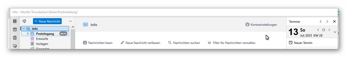 As soon as I open Thunderbird, the program freezes before I can click on anything. The password prompt box appears, but regardless of whether I click “Cancel” or try to enter the password, the program freezes and only displays “No response.” I am unable to click on any menu item, as the program freezes even then. I wanted to repair it via Windows, but only the “Uninstall” tab appears in the Control Panel, not “Repair”... It doesn't matter whether I start Thunderbird in safe mode or normal mode. The problem is the same. Version: Thunderbird x64 de 140.0.1 Does anyone have any idea how I can access my emails, which I urgently need? Many thanks! Ekki