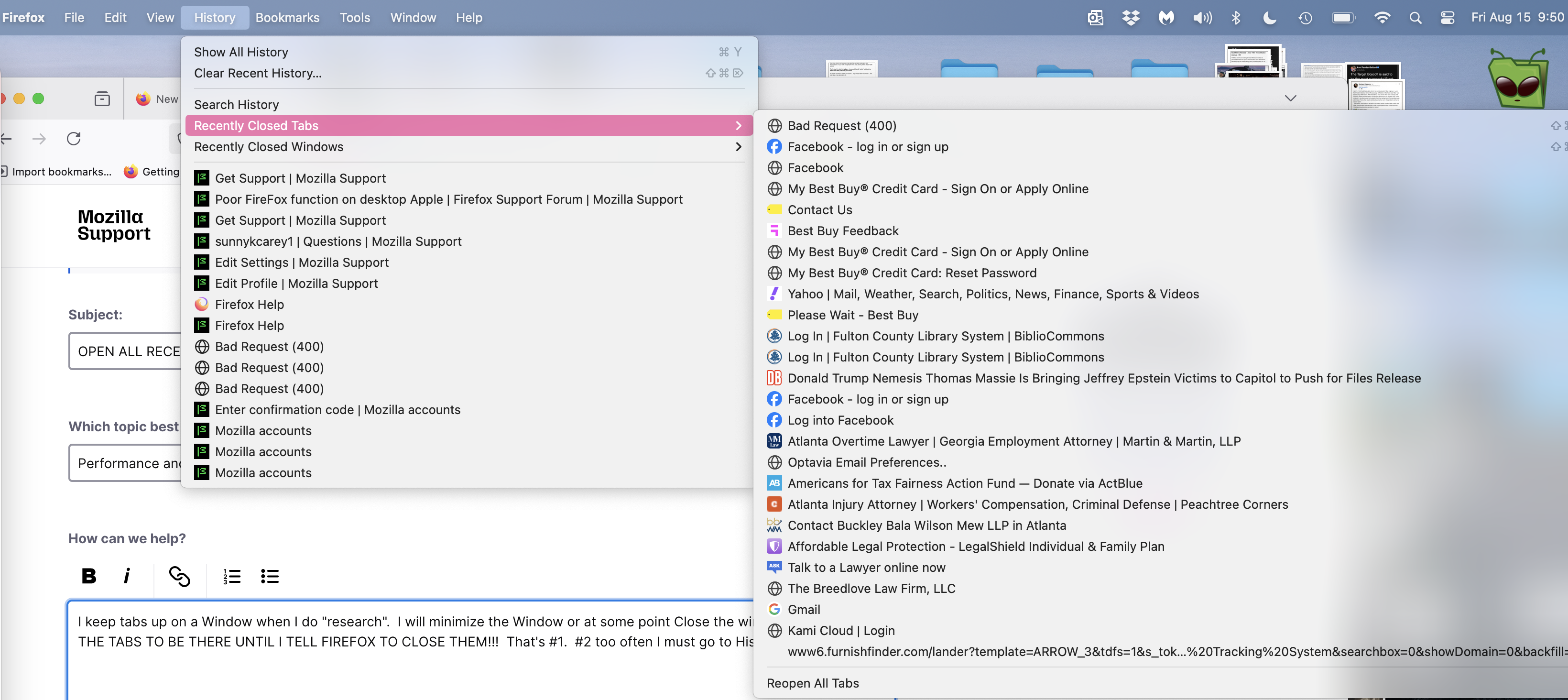 I keep tabs up on a Window when I do "research". I will minimize the Window or at some point Close the window eventually and I EXPECT MY TAB HISTORY TO BE THERE UNTIL I TELL FIREFOX TO CLOSE THEM!!! My choice!! That's #1.