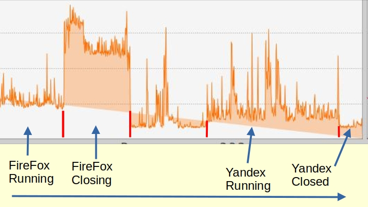 This is a graphical representation of the system loading from Task Manager. I have used Firefox and Yandex for comparisons too.