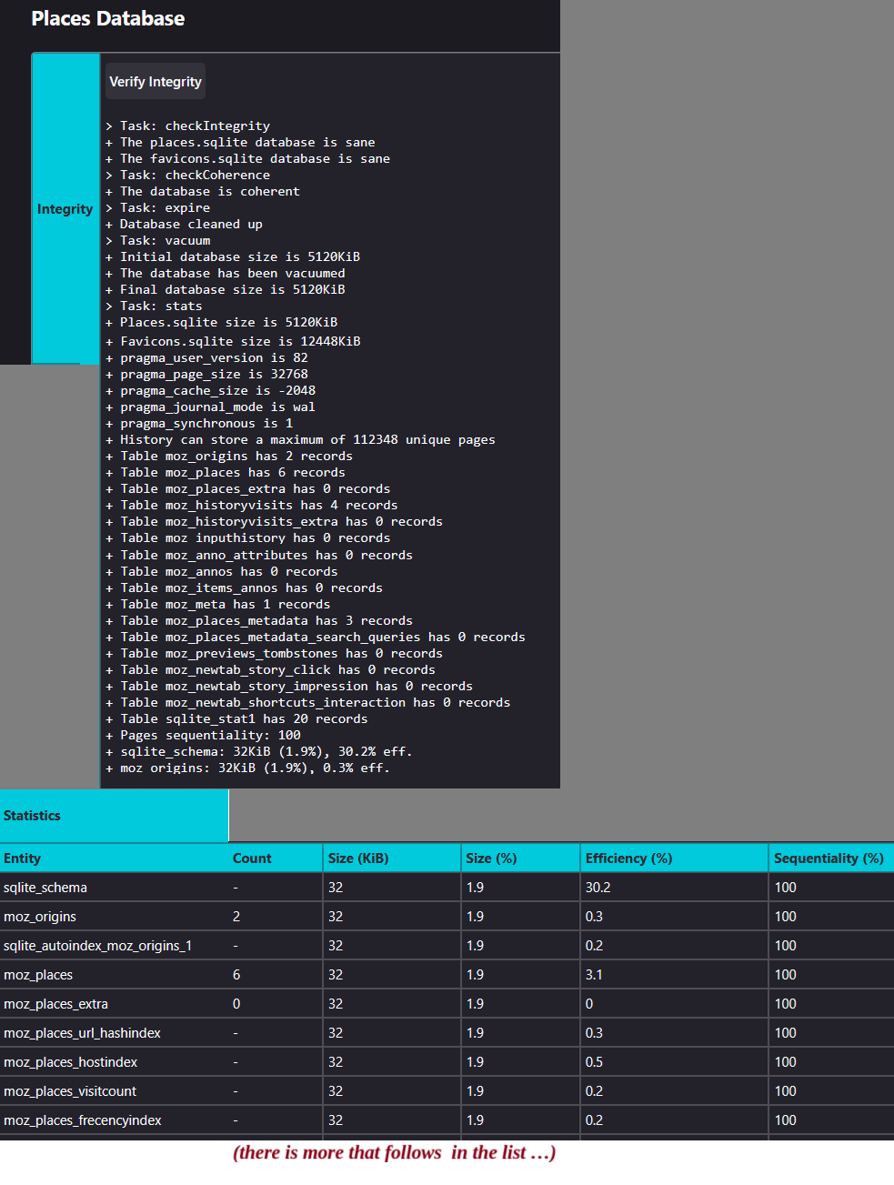 > Task: checkIntegrity + The places.sqlite database is sane + The favicons.sqlite database is sane > Task: invalidateCaches + The caches have been invalidated > Task: checkCoherence + The database is coherent