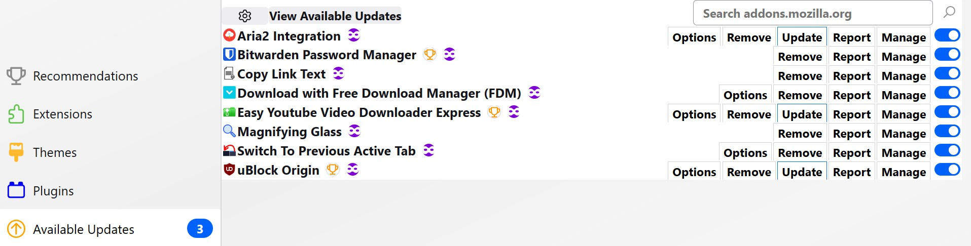 That bug has been fixed, but hasn't landed in release versions yet. The workaround I used was to do the manual update on one at a time, restarting FF after each.Can you tell me anything about the "recent updates" options. Is that not available without the css?