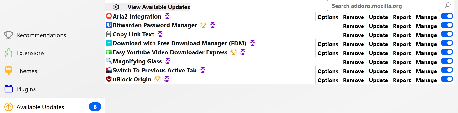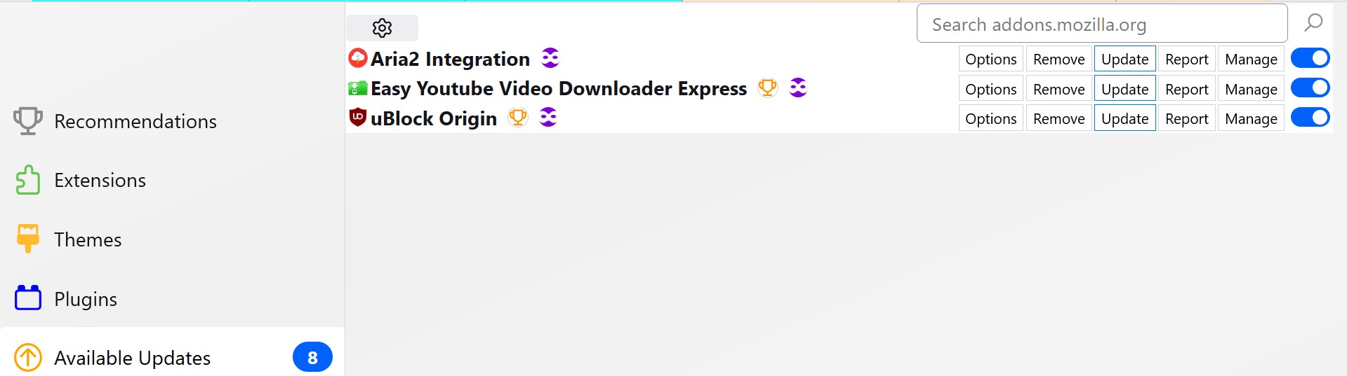 Next image shows eight addons available, but only three in the list, because the five not shown were already manually updated.