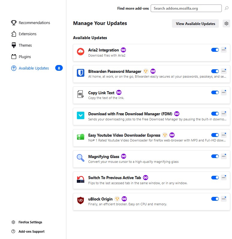 EDIT; Please see last two images just posted. On the left your see the indication of the remaining three remaining addons, of the original eight, still available for update, that I purposely did not manually update. To the right, we see the contents of Bitwarden, after which it was among was one of the five supposedly updated addons. But the version number and date are 4 months old.
