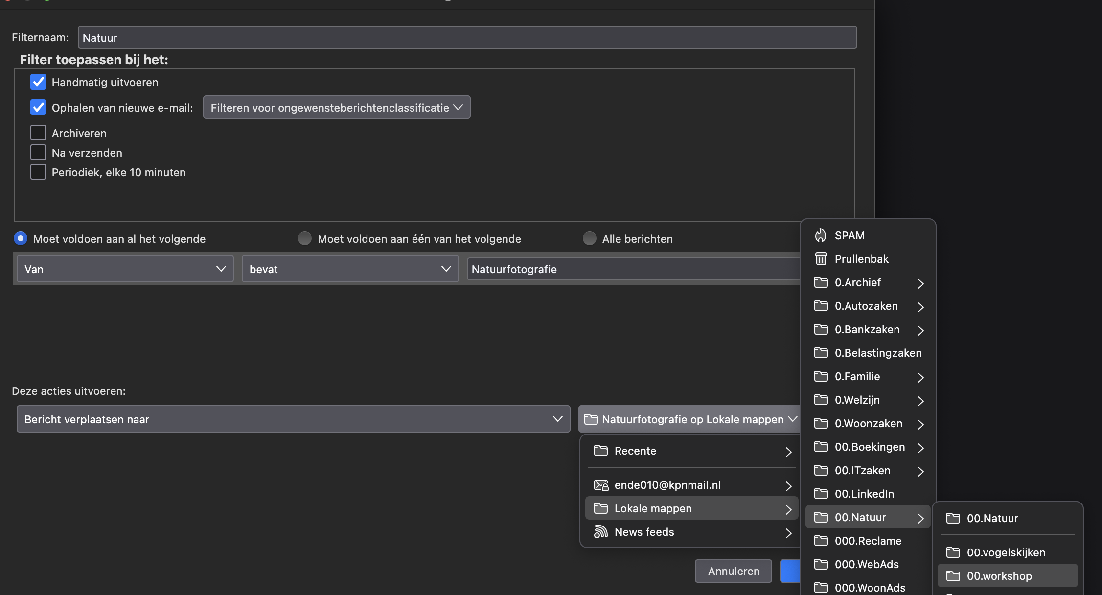 Hallo, ik gebruik berichtenfilters voor mijn e-mails , hoe moet ik deze instellen als ik submappen wil gebruiken in mijn Lokale mappen. Mijn filter is natuur ik gebruik verschillende akties voor div e-mails , maar voor meerdere lukt het niet in mijn hoofdmap bijv natuur lukt het wel ( zie voorbeeld ) maar in een submap vogels niet , als onderdeel van de filter natuur. ben benieuwd naar de oplossing