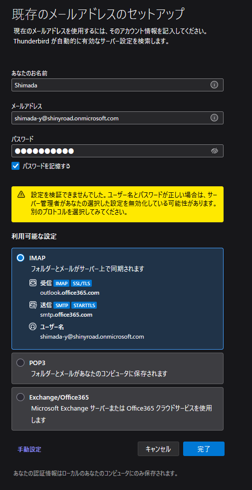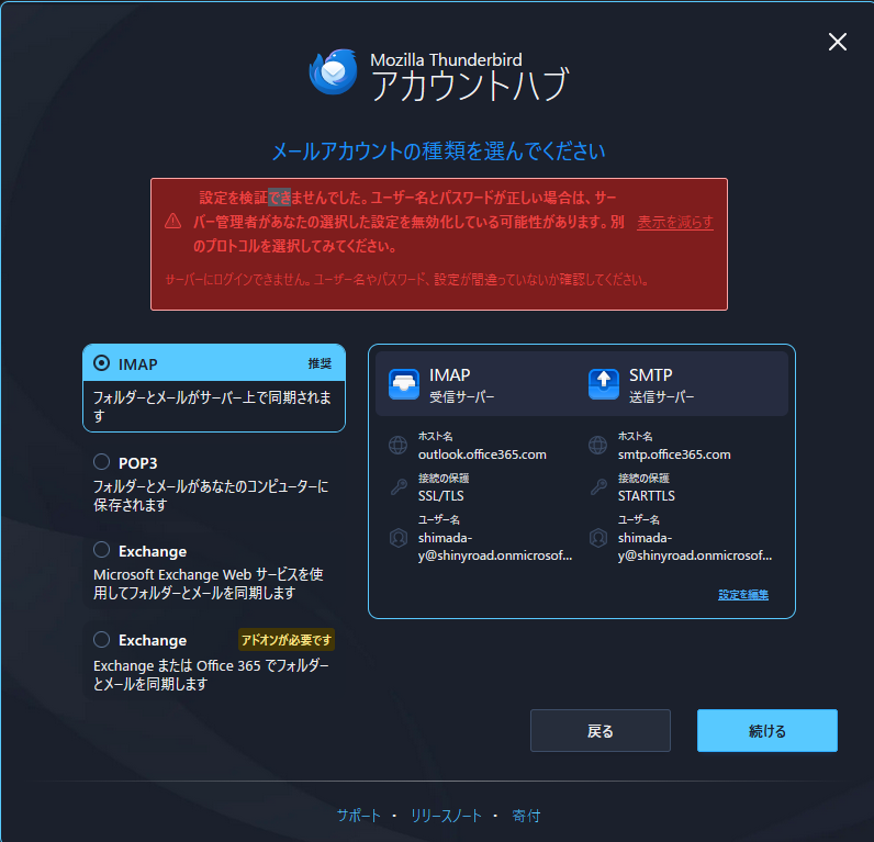 本件はIMAPでMicrosoft365アカウントをサインインしようとしたときに発生している事象です。 最初のユーザー追加画面で氏名とメールアドレスを入力します。 その後、メールアカウントの種類を選択する画面でIMAPを選択して「続ける」をクリックしても「設定を検証できませんでした。ユーザー名とパスワードが正しい場合は、サーバー管理者があなたの選択した設定を無効化している可能性があります。別のプロトコルを選択してみてください。」と表示され追加ができません。 上記メールアカウント選択画面で「設定を編集」をクリックしても結果は同様ですが、「詳細設定」→「テスト」をクリックすると、「次のアカウント設定が、指定されたサーバーを調べることにより見つかりました: 」と表示はされます。 しかし、続けようとすると「受信サーバーの設定がすでに存在しています。」と表示されてしまいます。 なお、Exchangeを選択した場合は追加できます。 Microsoft365アカウントについてはIMAPを有効化していますのでアクセスがブロックされているわけではないと考えています。 解決策を教えてください。