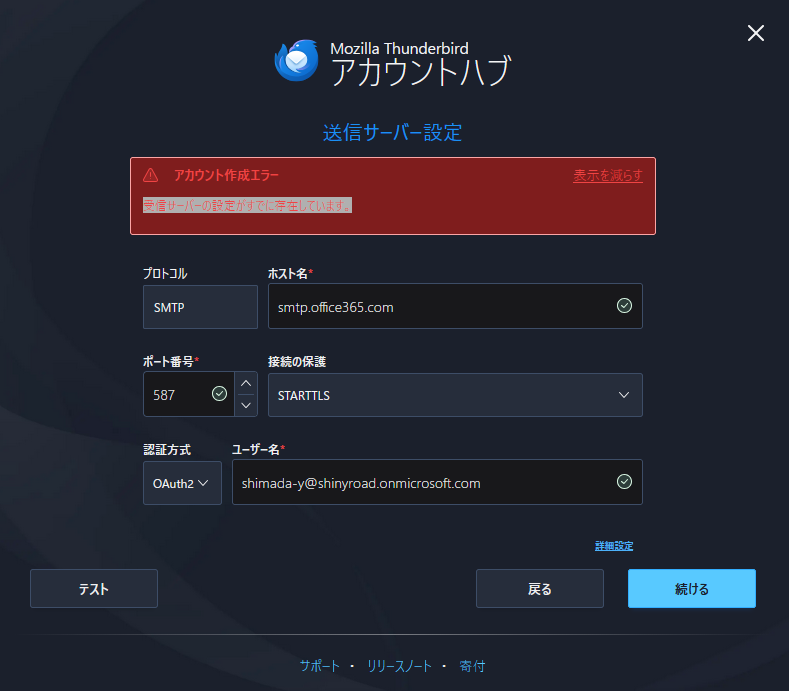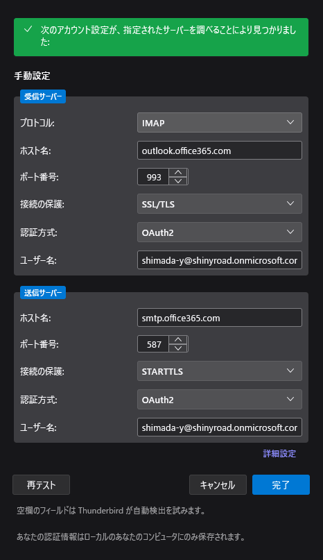 必要情報を入力して「再テスト」をクリックするとアカウント自体は存在しているように見えるんですが、「完了」をクリックすると失敗してます。 Microsoft365側で特に制限した記憶はないんですが、どこか見ておいたほうがいい箇所ってありますか?
