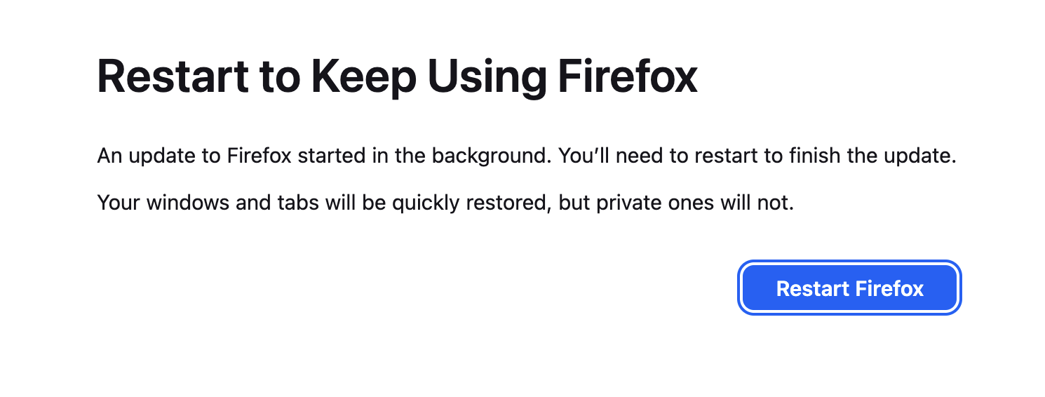 "Restart to Keep Using Firefox An update to Firefox started in the background. You'll need to restart to finish the update. Your windows and tabs will be quickly restored, but private ones will not."