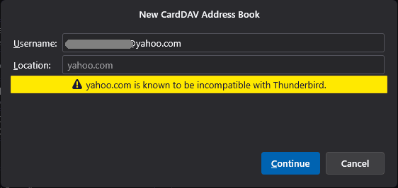 When I try to add a CardDAV contact list to Thunderbird's address book, I get the error message, "yahoo.com is known to be incompatible with Thunderbird." There's a "Continue" button, but it does nothing.