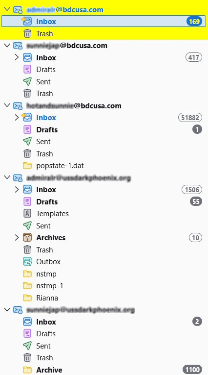 Fortunately, on my secondary laptop, I'm using Thunderbird 115.18.0 (32-bit) on the esr update channel, running 32-bit Windows 7 Professional. I say, "fortunately," because ALL folders and emails are still there, so I know they haven't been vaporized!