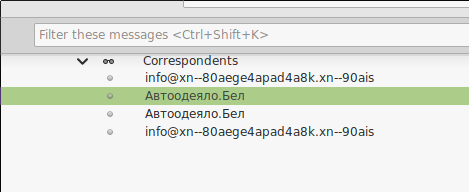 There are messages from IDN-domains in mailbox (IMAP). They are listed as "<sender>@<server-in-punicode>" in "From" column. I want to see such messages as "<sender>@<server-in-idn>". For example "info@xn--80aege4apad4a8k.xn--90ais" should look like "info@автоодеяло.бел"