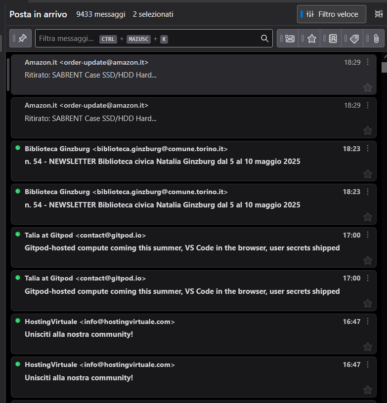 Non riesco a capire perché a volte, all'apertura di thunderbird, le email siano doppione costringendomi a riavviare il programma. In modalità risoluzione problemi questo non spunta, ma immagino sia perché appunto riavviando thunderbird si sistema.