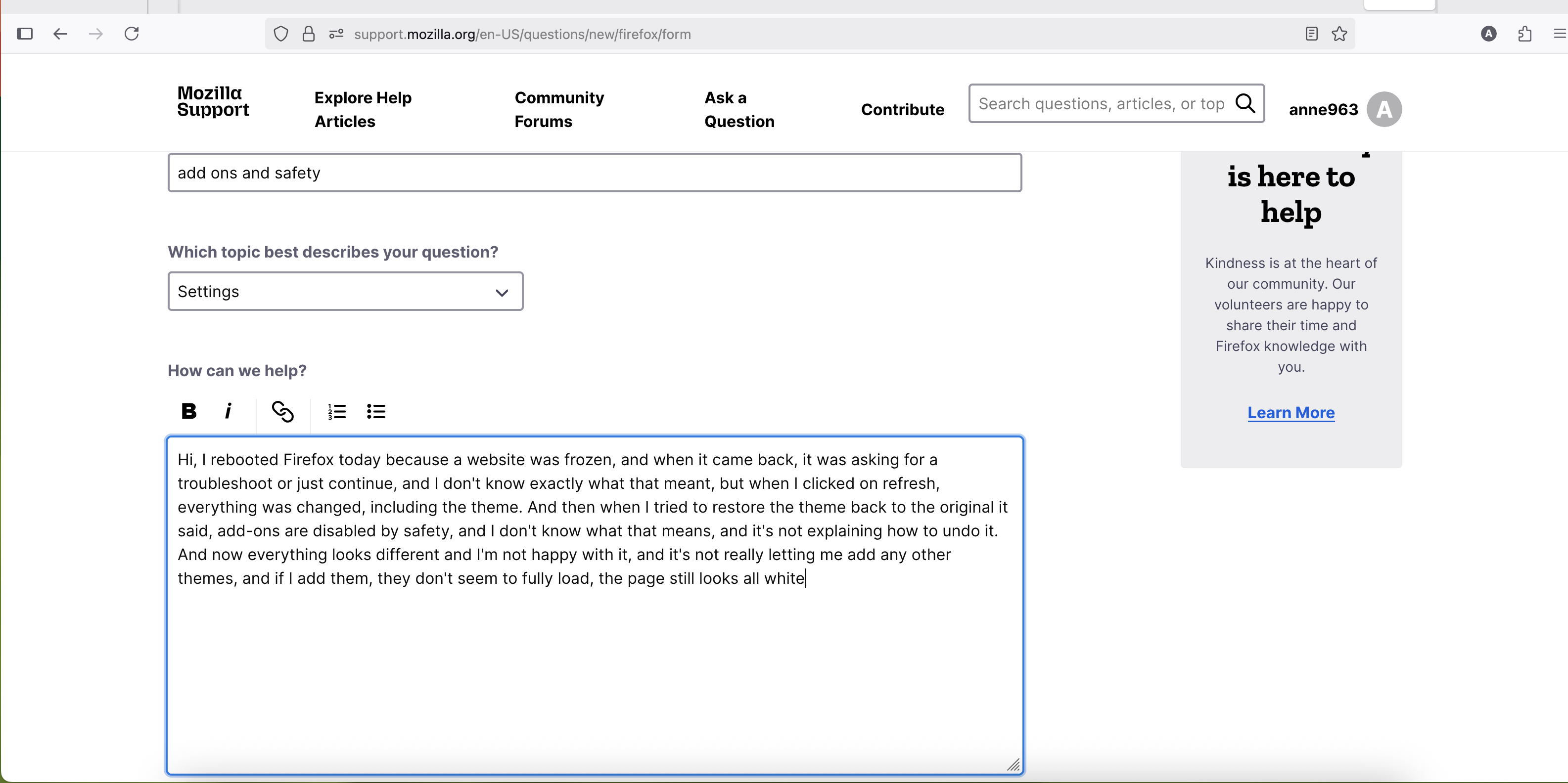 Hi, I rebooted Firefox today because a website was frozen, and when it came back, it was asking for a troubleshoot or just continue, and I don't know exactly what that meant, but when I clicked on refresh, everything was changed, including the theme. And then when I tried to restore the theme back to the original it said, add-ons are disabled by safety, and I don't know what that means, and it's not explaining how to undo it. And now everything looks different and I'm not happy with it, and it's not really letting me add any other themes, and if I add them, they don't seem to fully load, the page still looks all white