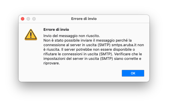Ho cambiato sistema operativo pasando a MacOs Ventura. Ho installato Thunderbird 144.0.1 come client di posta, ma non riesco a inviare messaggi tramite smtps.aruba.it, soltanto a ricevere (account POP3)