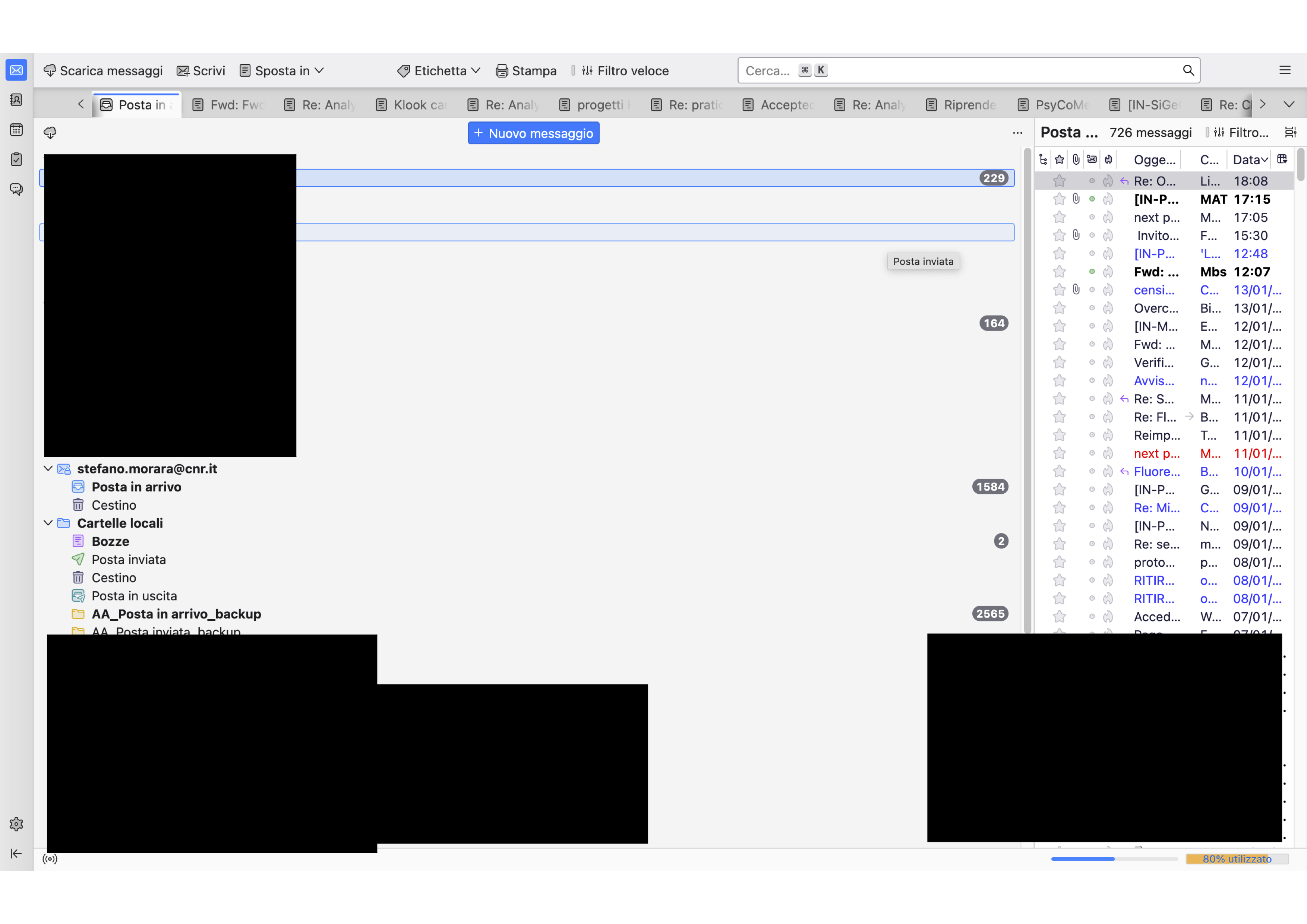 Versione di Thunderbird: 140.6.0esr (aarch64) Versione del sistema operativo: macOS Sequoia 15.7.1 Provider delle caselle email (Gmail, Libero, Hotmail, etc.): non sono sicuro di cosa rispondere: la mia ditta il Consiglio Nazionale delle Ricerche affida a Microsoft (attraverso Outlook) la gestione delle caselle di posta istituzionali Tipologia di account (POP3, IMAP): IMAP Estensioni installate: nessuna Messaggi di errore che vengono visualizzati durante l'utilizzo di Thunderbird: nessuno Software di sicurezza eventualmente presenti (Antivirus e simili): Avast Premium Security, versione 16.2.1g (dd4ac2357a41) Screenshot del problema (se utile a chiarire il contesto):