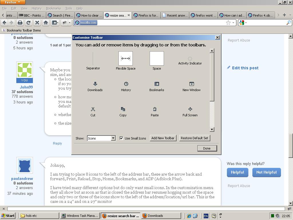 I have tried many different options but do only want small icons. In the customization menu they all show but as soon as that is closed the address bar resumes hogging most of the space and only two or three of the icons show to the left of the address/location/url bar. This is the case on a 24" and on a 27" monitor
