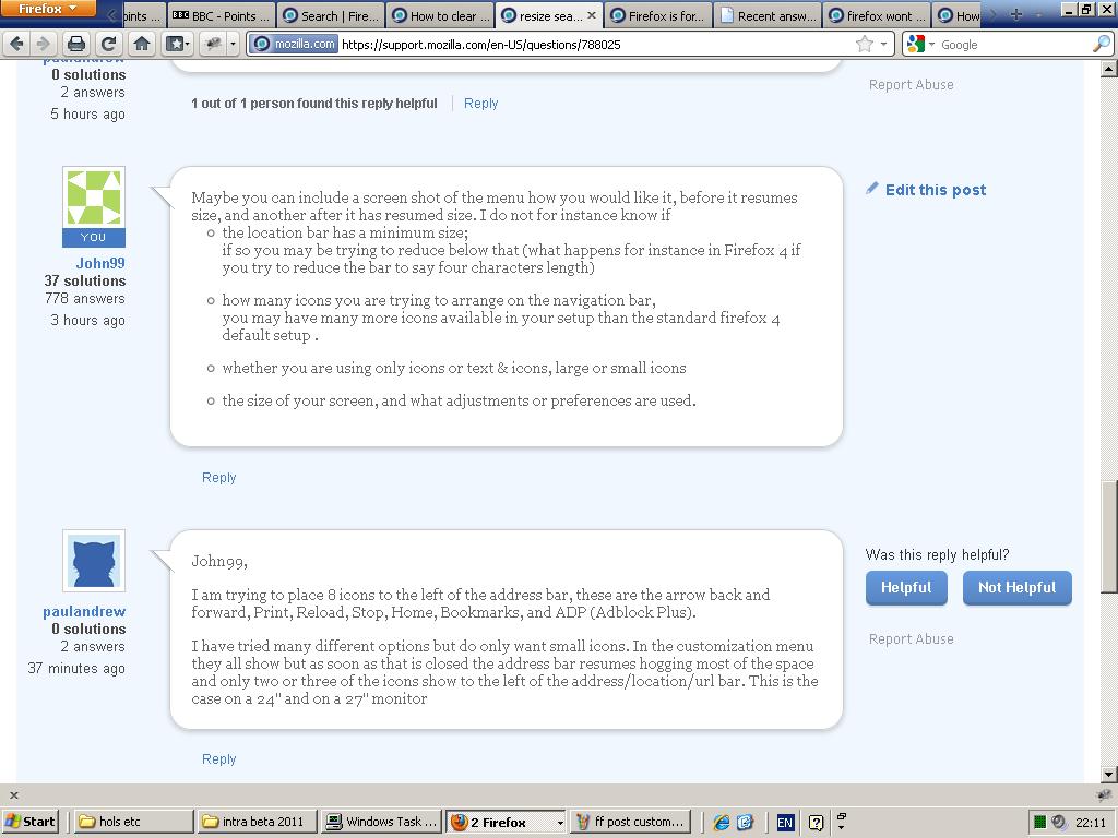 The auto resizing is not working. In the customization menu all the icons are set as I wish but close that and the address bar resumes size and the extra icons that have been selected are covered up. I don't find a way to shrink the humongous, way too long address bar down.