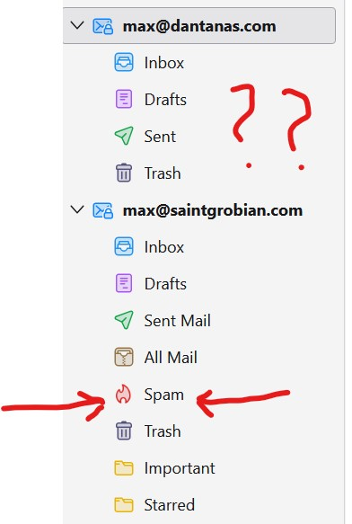 I use Thunderbird with multiple email accounts. Every one of them has a functioning Junk/Spam folder except for one: my Google Workspace account max@dantanas.com