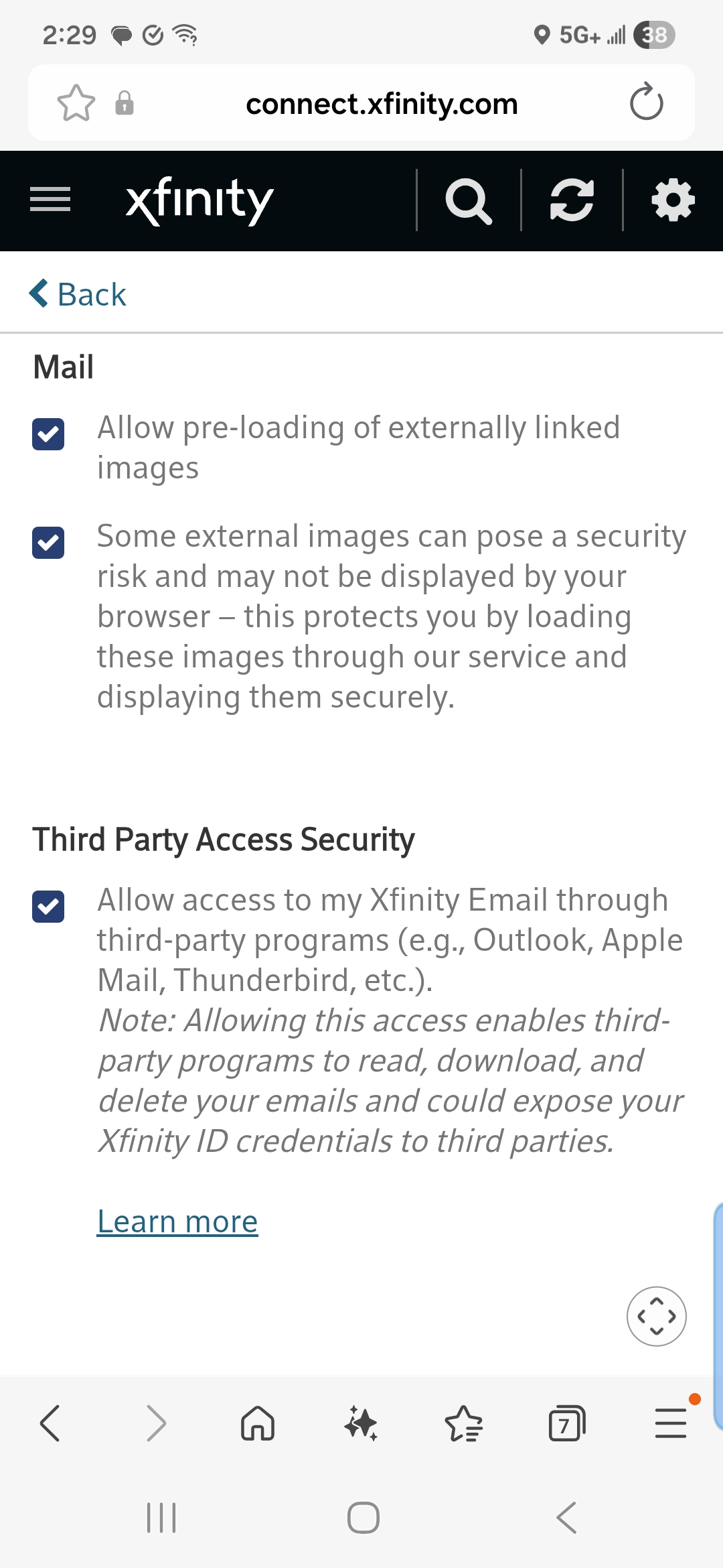 - Uncheck the box under Third Party Access Security to prevent third-party programs access to your Xfinity Email, or check the box to allow access.