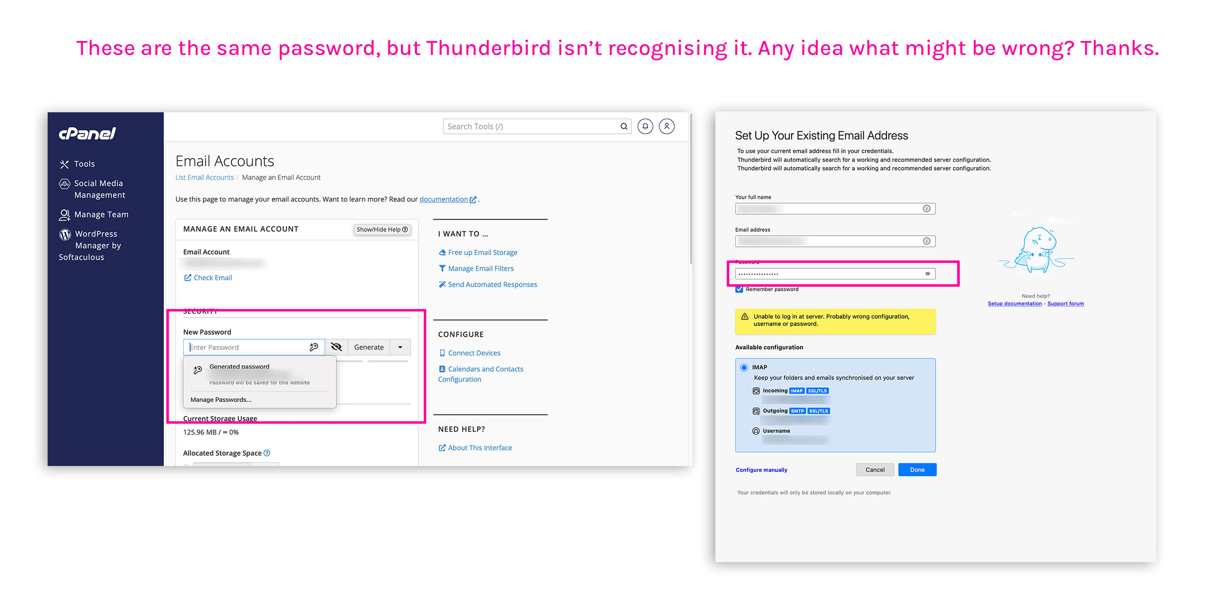 Hey, not sure why but my CPanel email address password doesn’t work despite restarting Thunderbird a few times. Any ideas greatly appreciated. Thanks, Claire