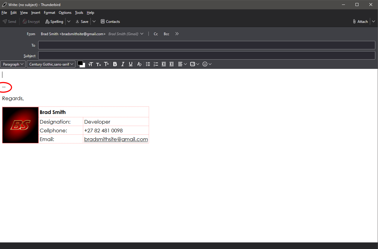 Why does Thunderbird keep adding the "--" to messages. Moved from Outlook to Thunderbird and every new message includes "--" (circled in the included picture).