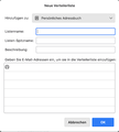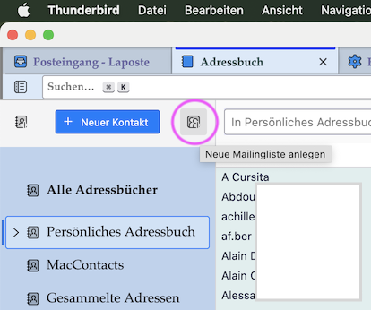 Open the Address Book tab. At the top of the sidebar panel click on the little symbol "Mailingliste anlegen". This will open a pop-up "Neues Verteilerliste" .... etc