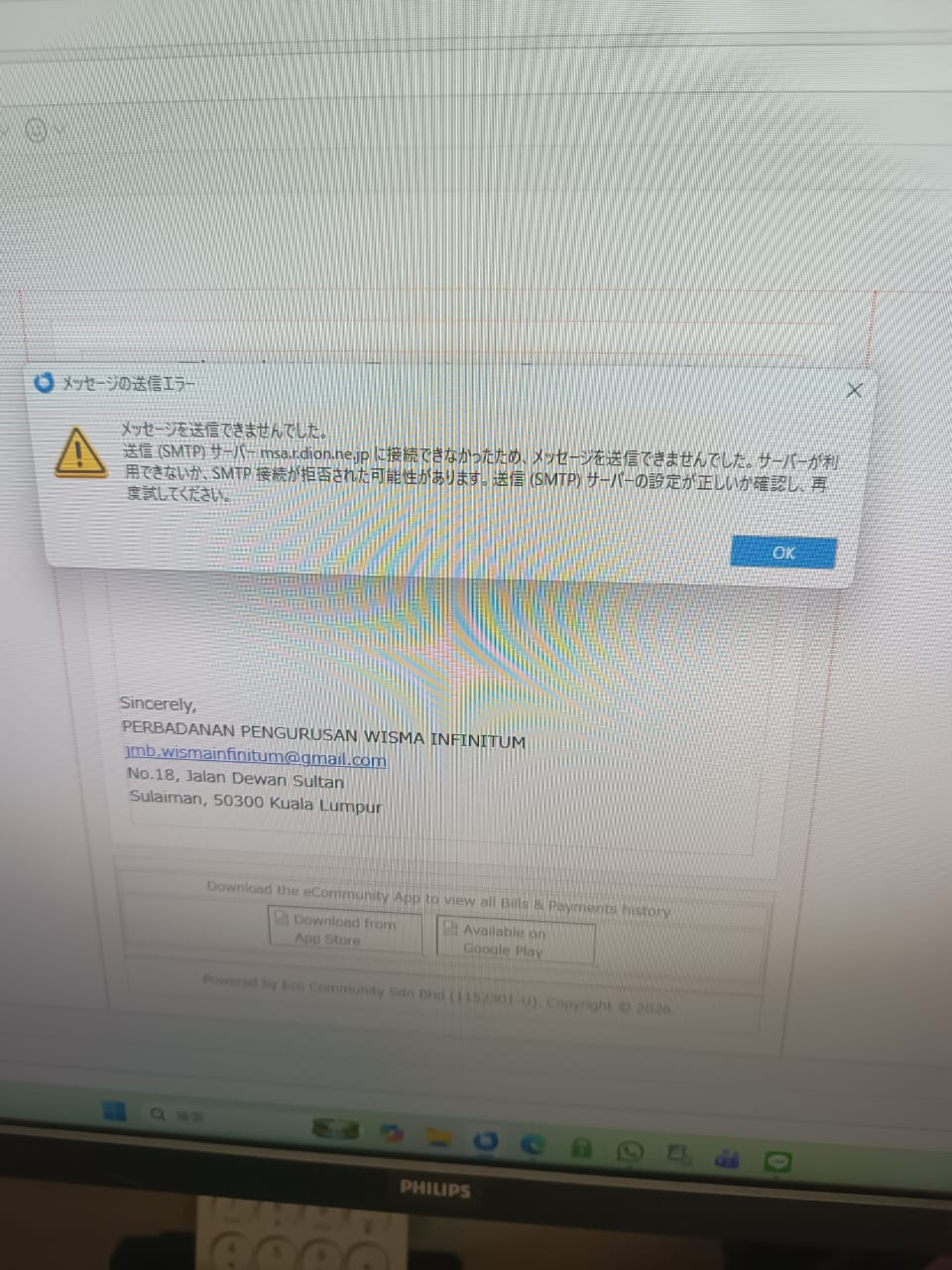 Message Sending Error The message could not be sent. The message could not be sent because the connection to the Outgoing (SMTP) server msa.r.dion.ne.jp failed. The server may be unavailable or the SMTP connection may have been refused. Please verify that your Outgoing (SMTP) server settings are correct and try again.
