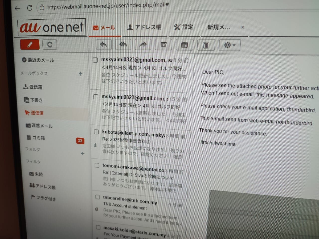 Suddenly, I can no longer send emails anywhere. I can still receive emails. I use KDDI, and I contacted them, but they said there are no issues with their servers. I can send emails using webmail. It seems to be an issue with Thunderbird. The message shown in the attachment appears, and I get an error. Please let me know how to fix this.