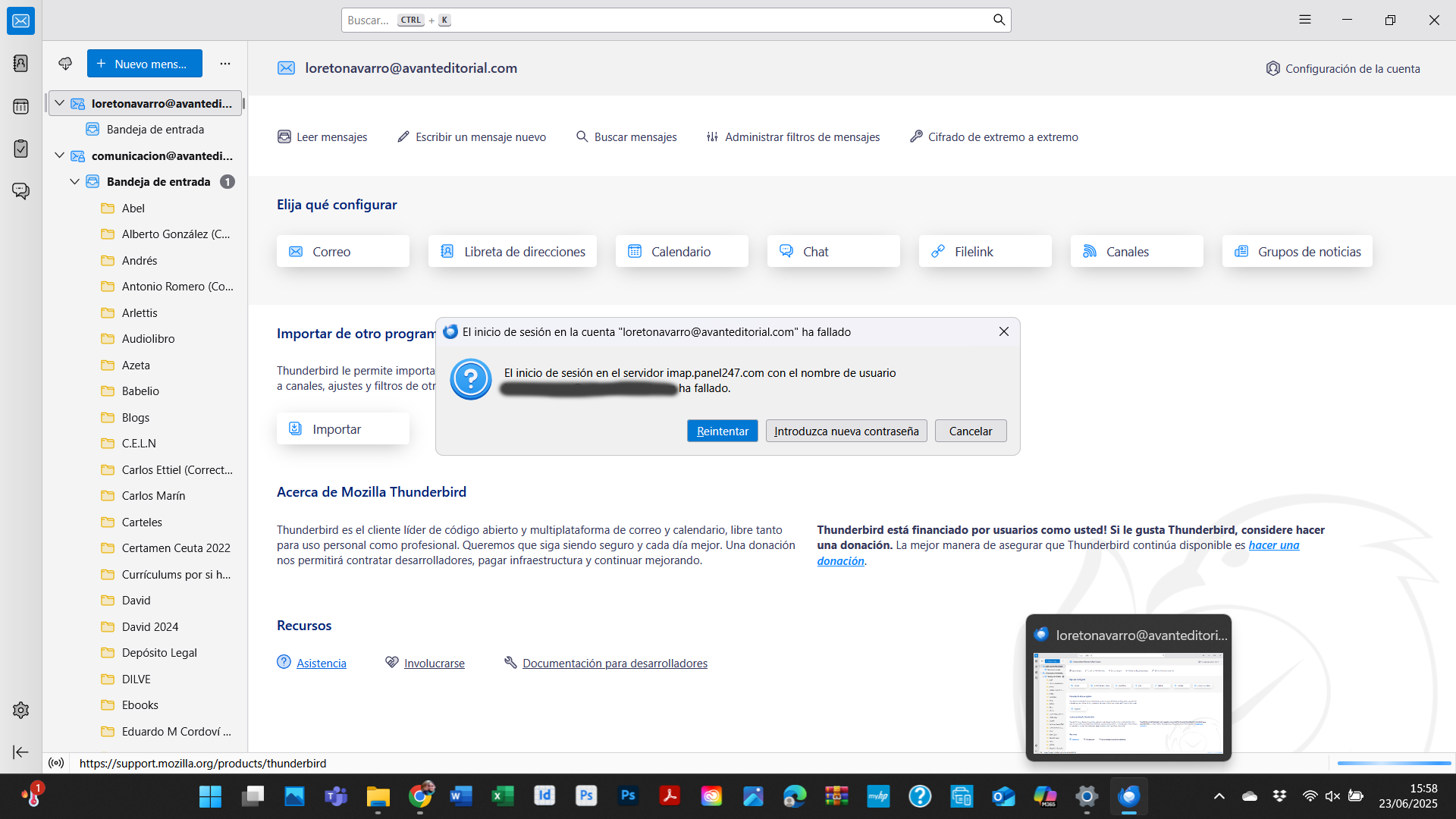 Desde esta mañana que no puedo utilizar mi cuenta de correo da error y buscando las soluciones que proporcionáis, ninguna ha dado resultado y no puedo trabajar, ya que es una cuenta de empresa. Por favor, díganme que puedo hacer. Gracias.