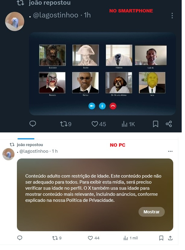 Na última semana não consigo visualizar alguns conteúdos na rede social X no pc, mas no smartphone consigo. Aparece um quadro com menção a "conteúdo adulto com restrição de idade", mas nenhuma das publicações era desse tipo. Anexo uma imagem da mesma publicação, vista no pc e no smartphone. Esta imagem não tem nada de conteúdo adulto, como poderão comprovar.