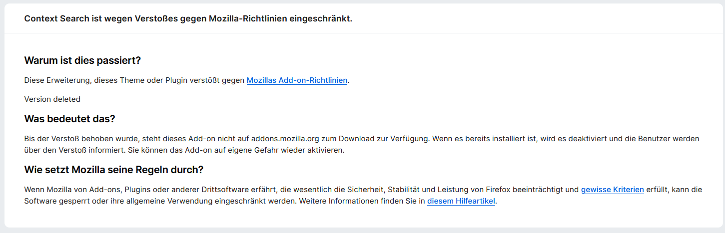 when clicking on "show details" regarding the automatic deactivation, I get this information, which to me, just seems like a generic text, except for "Version deleted". Could this be the autor of the addon deleting the latest release and firefox not automatically handing me the prior release via update because it's not the newest release stored in the system?