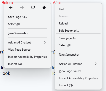 /* show text labels */ #context-back:after, #context-forward:after, #context-reload:after, #context-stop:after, #context-bookmarkpage:after{ content: attr(aria-label) !important; margin-inline-start: -19px !important; /* this pushes navigation text items to left, aligned with other menu items below */ }