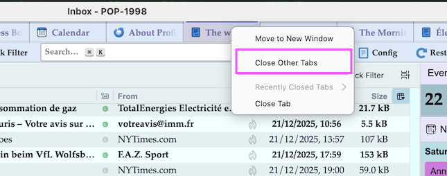 Thunderbird: My cat jumped on my keyboard while I was using Thunderbird, and, now I have every email I have in my Inbox opened about 50 times each, and each one in a separate tab.