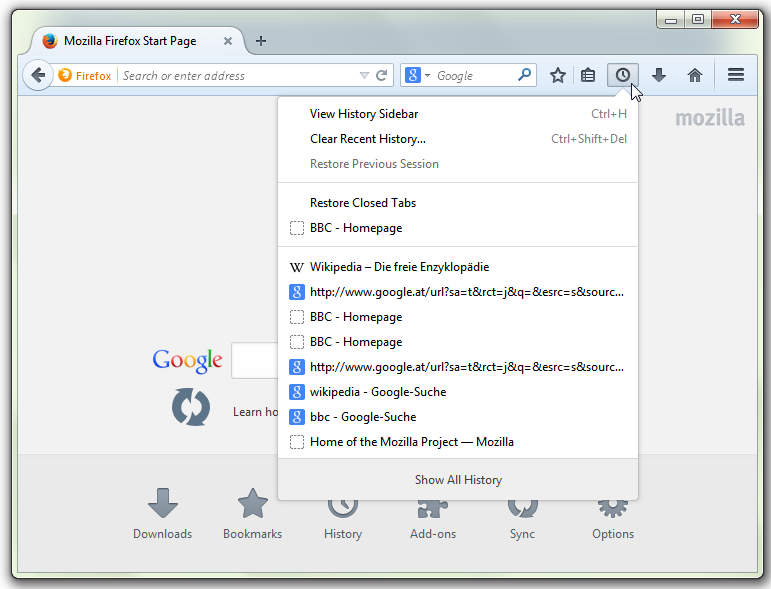 hello, my instructions from above weren't meant to refer to the history sidebar - please see the screenshot (per default the history button will be located within the firefox ≡ menu):