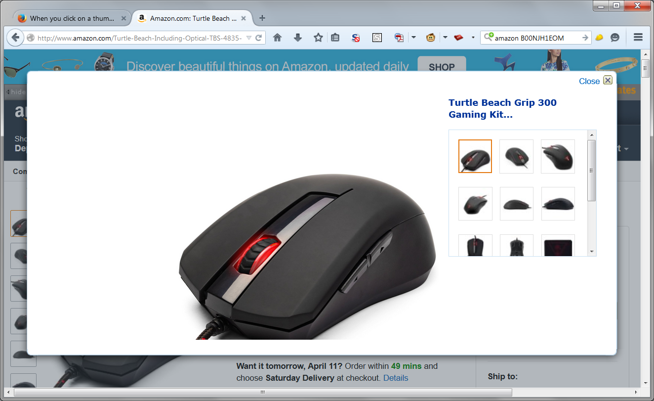 I have refreshed Firefox and my problem still exits. I've also asked a co-worker who uses Mozilla to try and she can't get the large box to open either. I work on Amazon constantly and have not run into this problem in the past. Example: If you search on Amazon with B00NJH1EOM, you should get the Grip 300 Mouse Kit. If you click on a thumbnail on the left side you should see what looks like the image I've attached.
