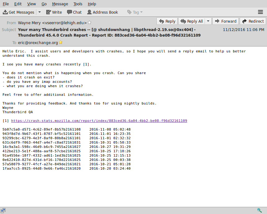 - I have had many Thunderbird crashes recently. The email mentioned that fact.