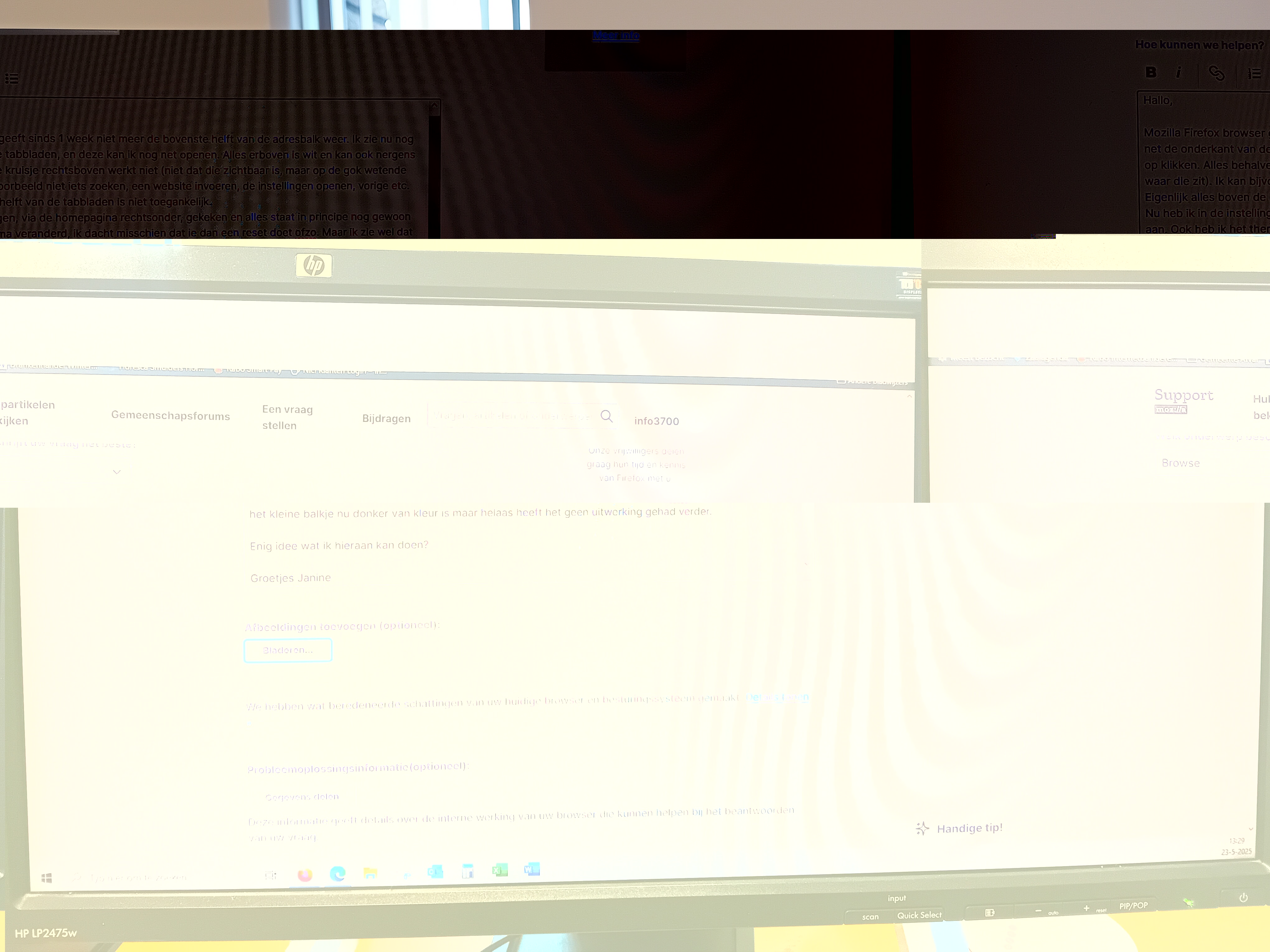 Mozilla Firefox browser geeft sinds 1 week niet meer de bovenste helft van de adresbalk weer. Ik zie nu nog net de onderkant van de tabbladen, en deze kan ik nog net openen. Alles erboven is wit en kan ook nergens op klikken. Alles behalve kruisje rechtsboven werkt niet (niet dat die zichtbaar is, maar op de gok wetende waar die zit). Ik kan bijvoorbeeld niet iets zoeken, een website invoeren, de instellingen openen, vorige etc. Eigenlijk alles boven de helft van de tabbladen is niet toegankelijk. Nu heb ik in de instellingen, via de homepagina rechtsonder, gekeken en alles staat in principe nog gewoon aan. Ook heb ik het thema veranderd, ik dacht misschien dat ie dan een reset doet ofzo. Maar ik zie wel dat het kleine balkje nu donker van kleur is maar helaas heeft het geen uitwerking gehad verder.