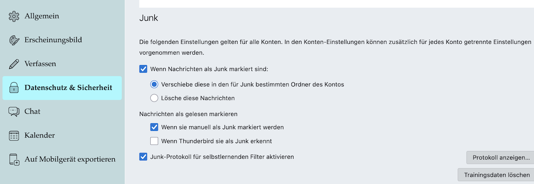 Welche sind die "globalen Einstellungen" für Junk in Einstellungen > Datenschutz & Sicherheit > Junk ?